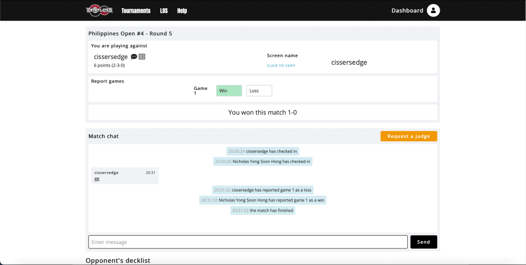 Once the match is done (either a best of 1, or best of 3 match), just click on the result if you’ve Won or Loss that match. Please be honest. It’s easy to detect if you do not report the correct result through the Game Log or if your opponent is livestreaming the game.