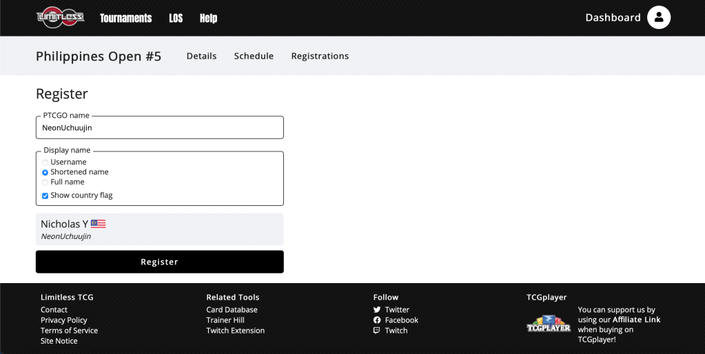 On this screen, you will be asked to confirm your PTCGO Name (very important!), plus how will you like your Display Name to look during the tournament bracket and standings. Once you’re ready, click on Register.