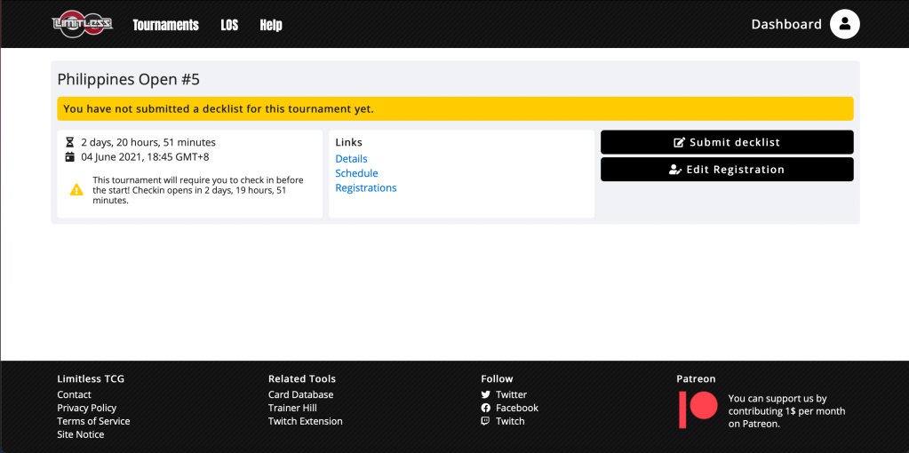 Next, you’ll need to submit a deck list before the deadline. You can either do this on the tournament information page we registered from earlier, or go to your Dashboard. Your Dashboard should show you how long you have before you need to submit a deck list for the tournament.