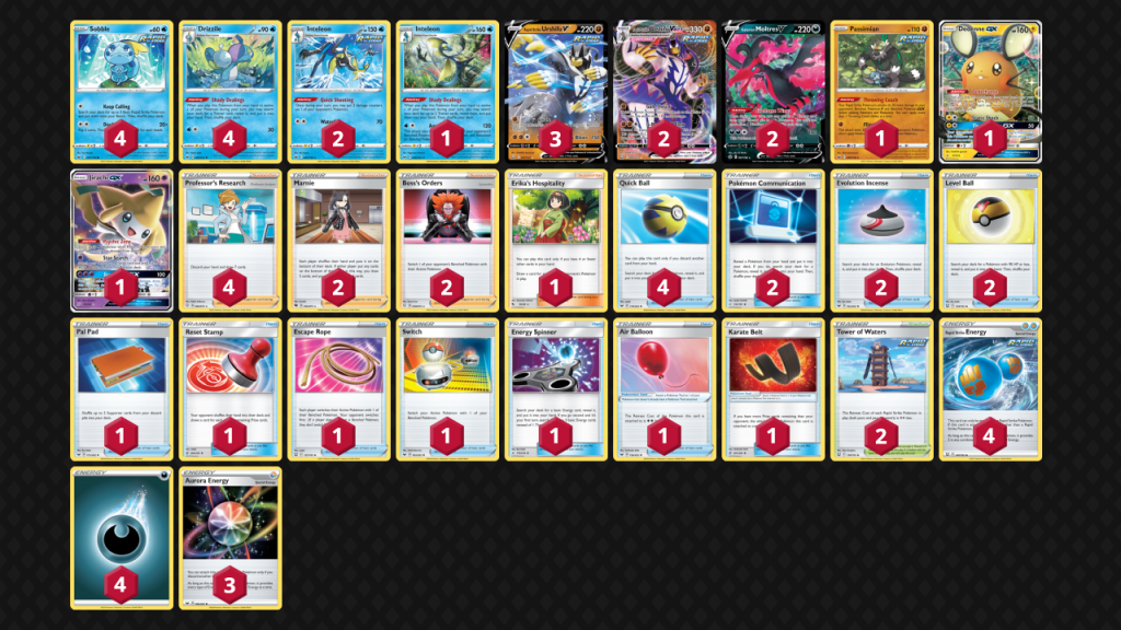 I have not tested much in the mirror against Rapid Strike Urshifu VMAX, but Galarian Moltres V could be important as its 190 damage + 150 damage from your own Rapid Strike Urshifu VMAX’s Gale Thrust attack will be able to deal a 2HKO. Galarian Moltres V is far easier to setup, especially with Drizzile’s Shady Dealings able to search for Darkness Energy through Energy Spinner. Because this deck includes Galarian Moltres V, deck space is thin so we had to omit Mew. Therefore, you need to take a KO on the opponent’s Mew to maximise G-Max Rapid Flow.