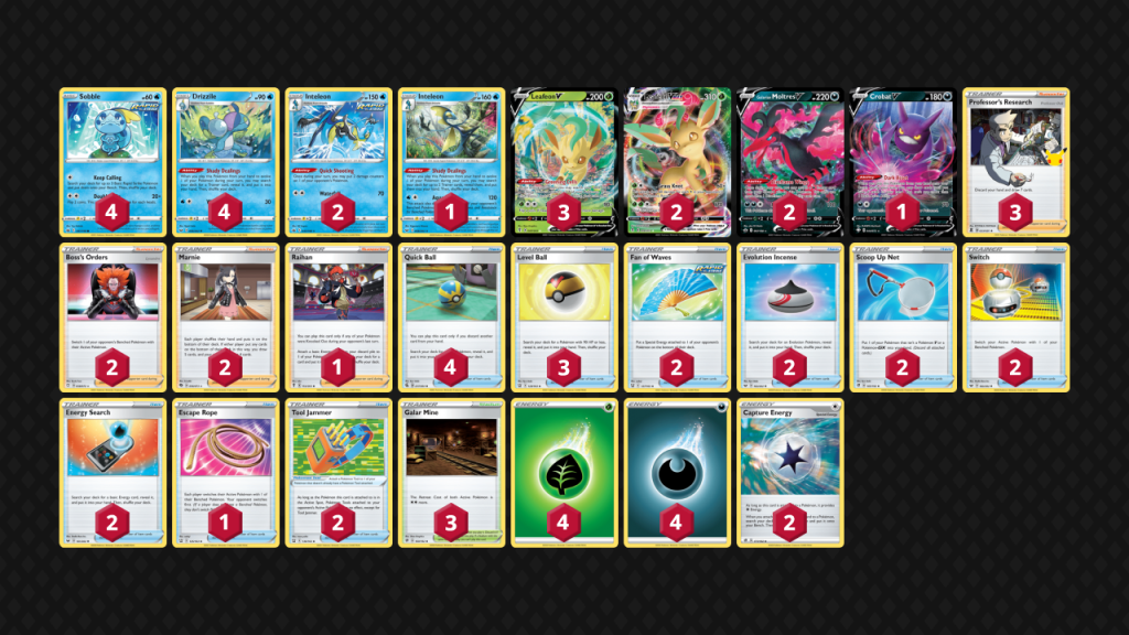 I love this deck because I feel the Drizzile + Inteleon Shady Dealings Ability results in the most consistent deck right now. The deck works like other Inteleon decks, but you have an additional advantage – Leafeon VMAX only requires two Energy to deal on average 240 damage together with Galar Mine.